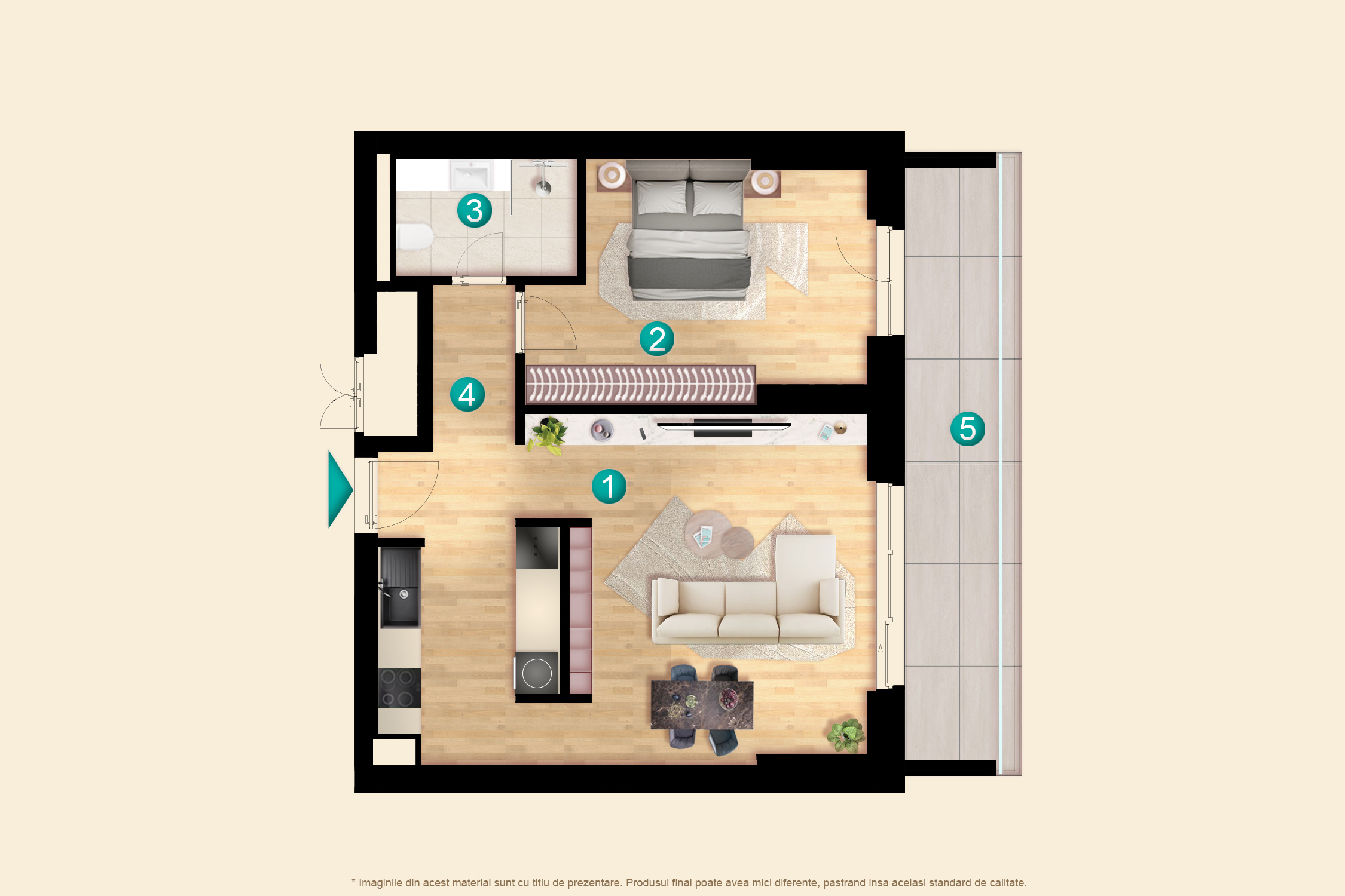 Apartament cu 2 camere tip 2A1, suprafață construită 7109.00 mp, (suprafață utilă totală 56.41 mp și terasă de 11.81 mp), semidecomandat, cu bucătăria deschisă, o baie.