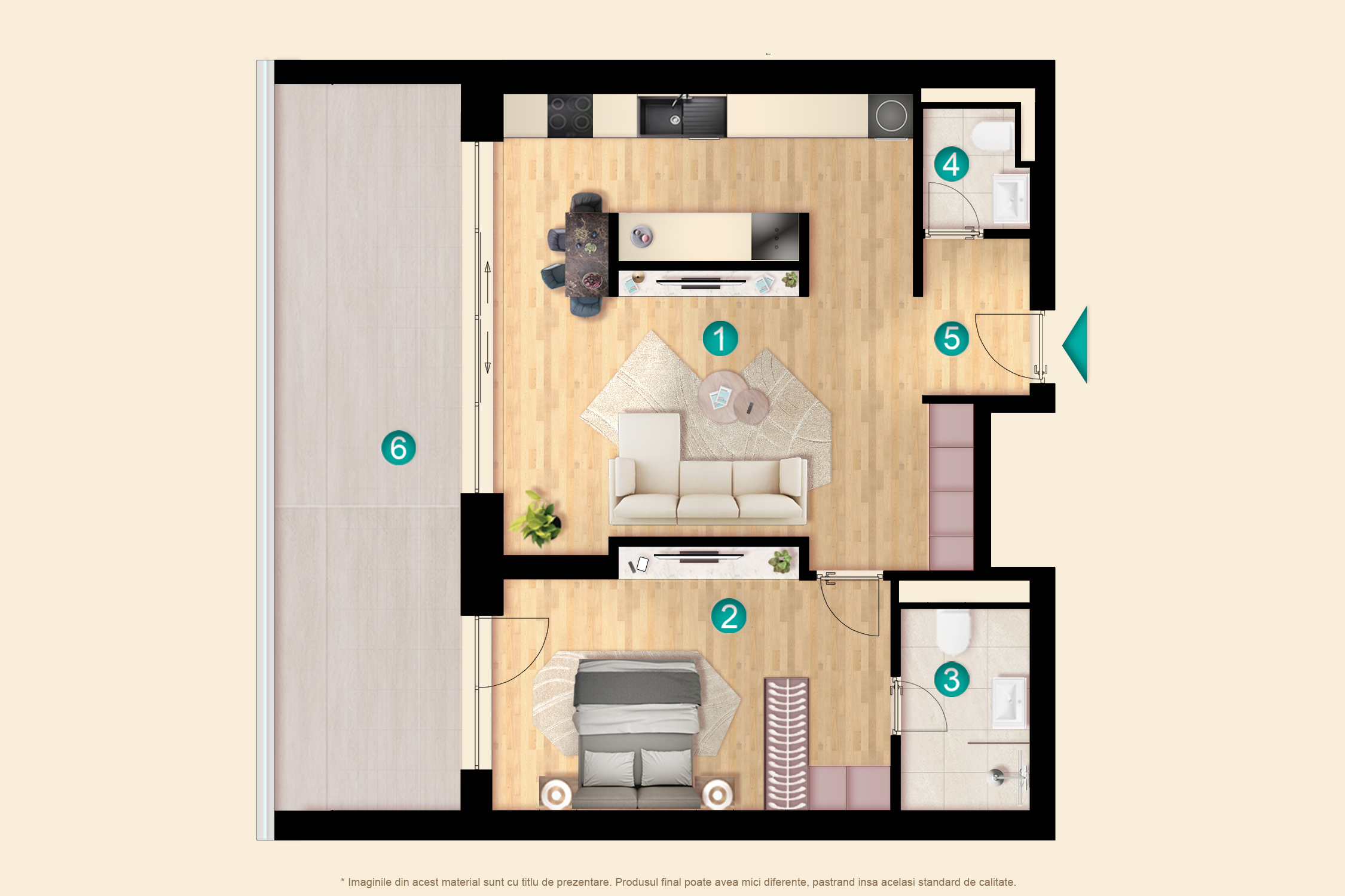 Apartament cu 2 camere tip 2K1, suprafață construită 95.15 mp, (suprafață utilă totală 64.37 mp și terasă de 17.43 mp), decomandat, cu bucătăria deschisă, 2 băi.