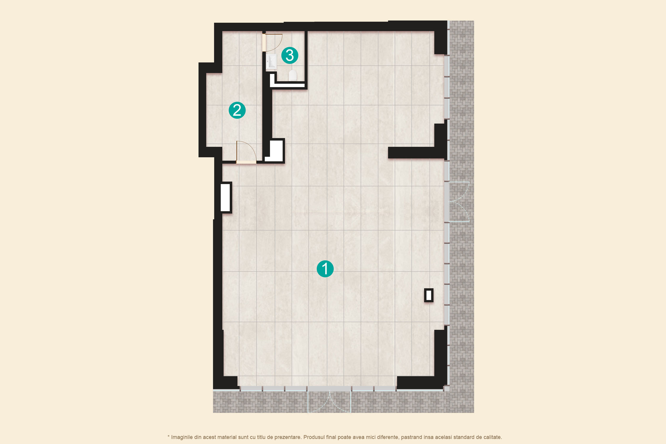 Spațiu comercial de tip SPC2, cu o suprafață construită de 159.55 mp, (suprafața utilă totală de 140.55 mp), semidecomandat, cu bucătăria deschisă, o baie, cu orientare spre S-E.