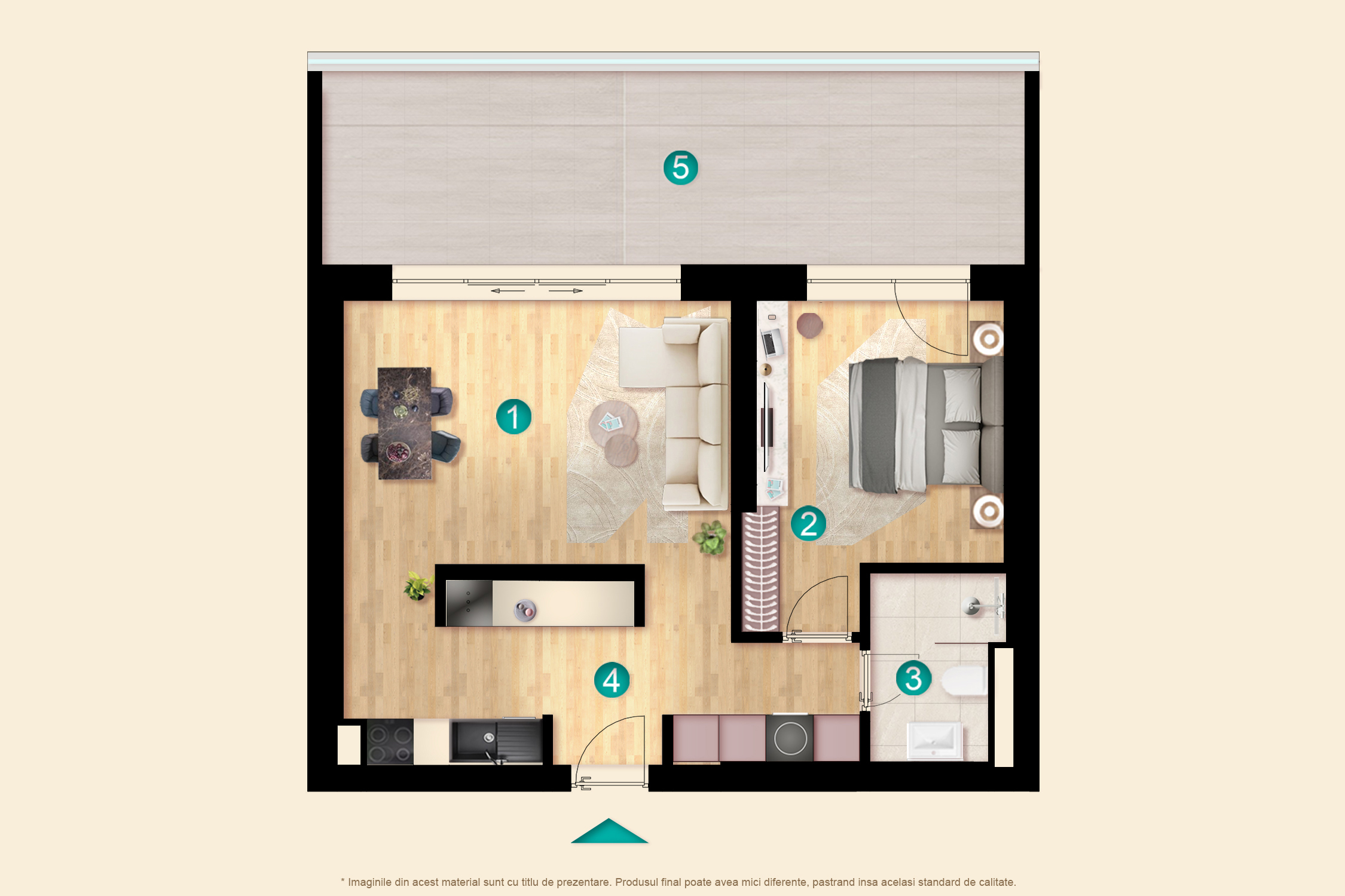 Apartament studio dublu tip 2I1, suprafață construită 61.17 mp, (suprafață utilă totală 46.77 mp și terasă de 15.36 mp), semidecomandat, cu bucătăria deschisă, o baie.